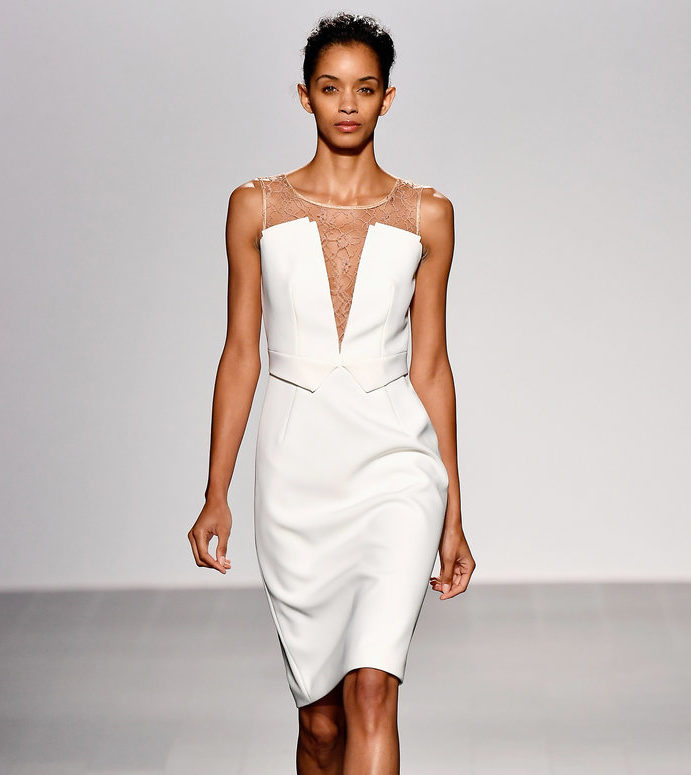Tadashi Shoji, for example, sent down the runway a sleeveless lace number with bold floral embroidery on its front that you could easily wear again after your big day.